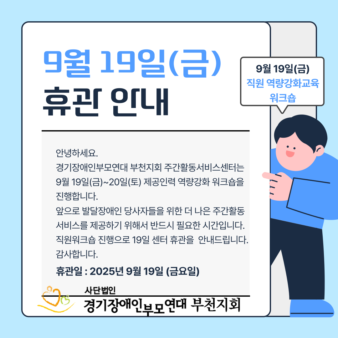 19일(금) 하루 센터 휴관을 진행하오니 이용자와 가족분들의 양해를 부탁드립니다.
