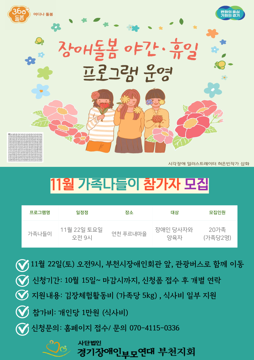 -토요일 오전 9시, 부천시장애인회관 앞에서 차량탑승 후 이동, 오후 5시 도착예정